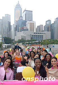 參加“第53屆世界小姐”選美大賽的110個國家和地區的佳麗,十一月九日乘車巡游香港島。中新社記者:錢興強