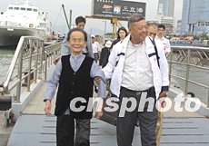 老大娘翁李榮旦在女兒和女婿的陪同下,高興地踏上廈門和平碼頭。作者:向天