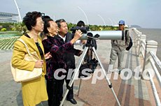 10日首次來廈門與養子傅宗漢相會的92歲金門老大娘翁李榮旦在兩家親人的陪同下,游覽廈門名勝古跡及新景觀廈門環島路、會展中心等地。圖為金門老大娘翁李榮旦在廈門環島路通過高倍望遠鏡觀看金門。作者:向天
