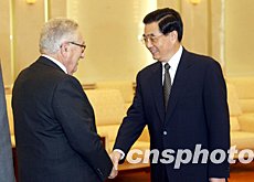 胡錦濤今天在人民大會堂會見了美國前國務卿基辛格博士,賓主進行了友好交談。胡錦濤對基辛格長期致力于中美友好、為中美關系正;鞒龅臍v史性貢獻表示贊賞。