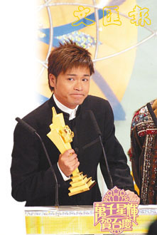 而“我最喜愛的男主角”一獎(jiǎng)中,賽前穩(wěn)操勝券的郭晉安眾望所歸,憑借對(duì)《憨夫成龍》里“阿旺”一角的出色表演奪獎(jiǎng)。領(lǐng)獎(jiǎng)時(shí)刻他激動(dòng)地感謝17年來(lái)支持他的人。郭晉安特別表示﹕“當(dāng)任何人都不相信我有機(jī)會(huì)站在頒獎(jiǎng)臺(tái)做男主角時(shí),很感謝梁家樹(無(wú)線戲劇組高層)給予我信心。”