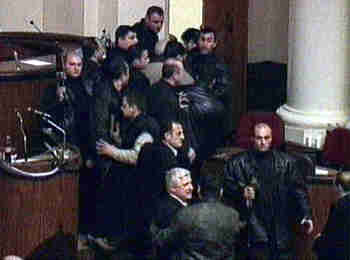 22日下午,數千名格魯吉亞反對派闖入格魯吉亞總統謝瓦爾德納澤正在發表演說的國會大樓內,謝瓦爾德納澤倉促離開國會大廈。(路透社圖)