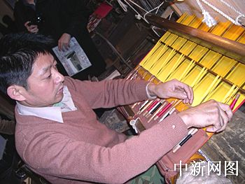 織造南京云錦的老式提花木機,每臺織機須有提花工和織造工兩人配合,前者在上,后者在下,上下協同生產。兩人勞作一天,僅能織造云錦五厘米長。
