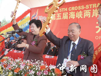 全國政協副主席張克輝與福建省委副書記、省紀委書記梁綺萍女士,在第五屆海峽兩岸(福建漳州)花卉博覽會開幕儀式上,共同轉動此次盛會的金鑰匙。蔡文原攝