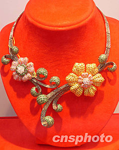 一款由一千多顆不同顏色的珠寶鉆石鑲嵌而成的項鏈,十一月二十八日在香港會展中心舉行的“第十一屆香港國際珠寶廠商展覽會”上展示,繽紛多彩的外貌恰如其“萬紫千紅”的名稱,顯示即將到來的中國新年喜氣。作者:潘索菲
