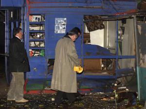 格魯吉亞警方在國家電視中心爆炸現場勘察。(美聯圖)