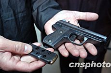 北京東城警方將持槍入室搶劫達二十一萬元人民幣的犯罪嫌疑人蔡某(男)及同案犯押解回京,并收繳案犯使用的仿64式真彈手槍及子彈。中新社記者:任海霞