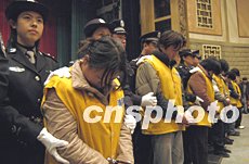 北京警方十二月九日對在冬季百日會戰以來查處的聚眾賭博、吸毒販毒、制假販假等五十余名違法犯罪人員進行公開處理。中新社記者:任海霞