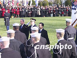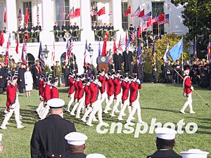 布什與溫家寶在白宮南草坪歡迎儀式上檢閱軍樂隊(duì)行進(jìn)表演。中新社記者 余東暉 攝