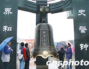 由南京鋼鐵集團澆鑄的“和平大鐘”十二月十一日正式落戶南京大屠殺遇難同胞紀念館,以銘記歷史教訓,祈禱世界和平。大鐘高3米,寓意紀念30萬遇難同胞;總重量6.6噸,表示大鐘于南京大屠殺遇難者66周年祭日鑄建;下擺口徑為1.937米,意為日軍全面侵華及南京大屠殺發生的年份。該鐘外形仿明式青銅古鐘樣式,鐘體正面是著名書法家啟功書寫的“和平大鐘”鐘名,背面刻有“前事不忘、后事之師,以史為鑒、開創未來”16個大字,兩側分別刻有銘文和浮雕。作者:丁梅