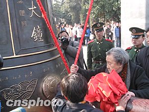 集會(huì)上,南京大屠殺幸存者和各界代表一起,敲響了“和平大鐘”,一共六十六聲。