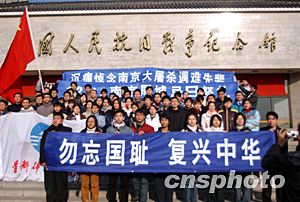 十二月十三日,南京大屠殺遇難同胞66周年祭暨《改造日本戰犯紀實》展覽在北京中國人民抗日戰爭紀念館舉行,來自北京體育學院的大學生及愛國者同盟網的人士打出標語,紀念在抗日戰爭中遇難和犧牲的同胞和英烈。中新社記者:武仲林