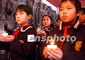 十二月十三日,南京大屠殺遇難同胞66周年祭暨《改造日本戰犯紀實》展覽在北京中國人民抗日戰爭紀念館舉行,來自盧溝橋小學的同學們手捧蠟燭,向在抗日戰爭中遇難和犧牲的同胞和英烈致以沉痛哀悼。中新社記者:武仲林