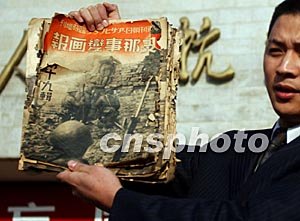 也在今天,幾本揭露當年侵華日軍罪行的畫冊由溫州晚報社贈送給抗戰紀念館。這家報社的編輯周麗峰介紹,這幾本發黃的《支那事變畫報》系日本朝日新聞社出版,今年十一月被溫州經營紙盒加工的企業從進口的日本廢紙中發現,畫冊中報道了一九三七年以后日軍在北平、天津、漢口、安慶等地的一系列軍事行動。