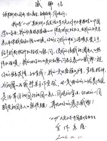 我們是“11·24”莫斯科人民友誼大學火災事件中不幸遇難的中國留學生家屬,我們懷著極其悲痛的心情赴俄處理后事。在我們為失去親人而深感悲傷不振的時候,你們向我們伸出了溫暖關愛之手,給予我們精神和物質的慰問,使我們信感祖國親人的熱情和溫暖。我們對你們的關懷和慰問表示衷心的感謝!祝你們生意興隆、事業有成!