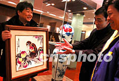 中國工藝美術師、陶瓷專家熊鋼如(左),十二月中旬在北京王府井景德鎮陶瓷城展示他的瓷畫“猴子與桃子”。隨著中國農歷猴年的臨近,以猴為形象的工藝品與日俱增。中新社記者:王麗南