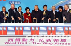 香港九廣西鐵12月20日正式通車,圖為行政長官董建華、環境運輸及工務局局長廖秀冬、九廣鐵路主席田北辰等嘉賓在錦上路站主持啟用儀式。中新社記者:洪少葵