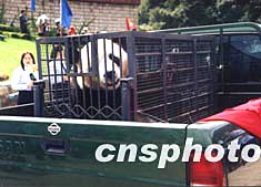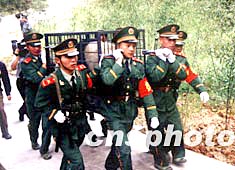 圖為關在籠子里的大熊貓被武警抬進“新家”。