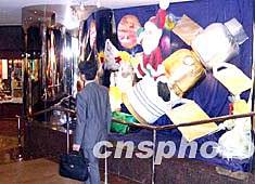 隨著“神舟五號”載人飛船的成功返回,香港也曾掀起一股航空熱。在商場圣誕裝飾中,以圣誕老人乘飛船亦成為香港圣誕裝飾一景。中新社記者:譚達明