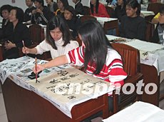 參加“二零零三印尼華裔青少年中國民族舞蹈及中華武術(shù)冬令營”的印尼少年,圣誕節(jié)期間在湖南練習(xí)中國書法。作者:李斌