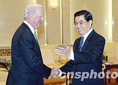 中新網12月29日電 據中國外交部消息,2003年12月29日下午,中國國家主席胡錦濤在人民大會堂會見了美國總統特使、前國務卿貝克。賓主進行了友好的談話。
