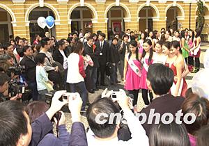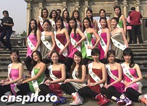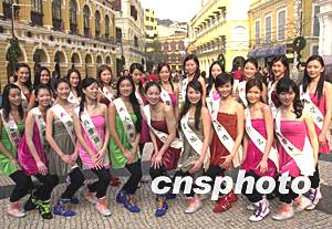 《2004年度國際華裔小姐競選》二十一位候選佳麗三十一日到澳門作一天親善訪問,圖為佳麗們在市政廳留影。作者:李剛