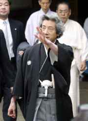 小泉2001年競選總裁時承諾每年8月15日參拜靖國神社。然而,出于對中國、韓國等鄰國的顧慮,同年提前于8月13日參拜。