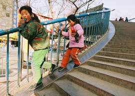 乞討之余,兩個小乞丐流露出孩子貪玩的天性。 燕趙都市報 王文康/攝影