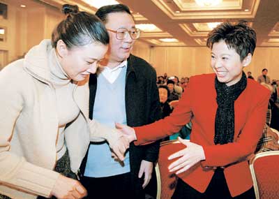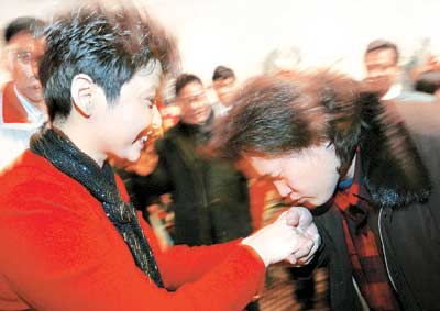 在記者印象中,從來沒有一位歌手的發布會辦得如此氣派。在中國大飯店地下一層的發布會現場,樓道里、會場內,有上百個花籃。在現場,記者看到閻肅、谷建芬、金鐵霖、卞留念、徐沛東、王佑貴、殷秀梅、楊鴻基、戴玉強、關牧村、李琦、郭達、朱時茂、孫悅、蔡國慶、毛寧、韓紅等嘉賓云集。當然,最惹眼的還是當今民族樂壇最有影響力和號召力的三位“大姐大”——彭麗媛、董文華和宋祖英的聚首,成為難得一見的景色。三位“大姐大”的老師——中央音樂學院院長金鐵霖先生也著實地風光了一把。