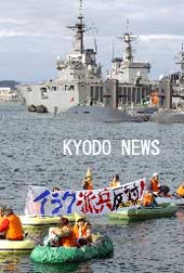 參加游行的25人,分開乘坐13條橡膠船。揭起“絕不允許自衛(wèi)隊(duì)的海外派兵”的橫幅,在可能被派遣的艦艇“國東”的附近舉行海上游行。