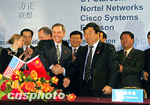 13日,中國電信、中國移動(dòng)、中國聯(lián)通等電訊企業(yè)與美國公司在華盛頓簽署23億美元電子通訊產(chǎn)品的采購協(xié)議。這是中國兩個(gè)月內(nèi)向美國派出的第三批采購團(tuán),共簽署訂單114億美元。圖為雙方代表簽字后熱烈握手。作者:李斌