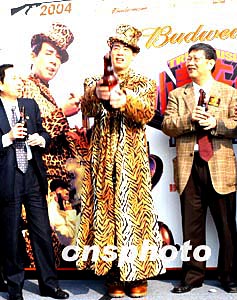 歌星陳小春1月14日在香港舉行《陳小春夜生活演唱會》記者會,陳小春會上為演唱會預祝成功用贊助商特別制的大型啤酒噴紙屑。作者:鄧慶樂