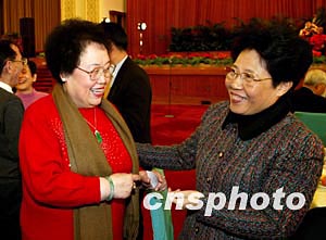 2004年僑界新春茶話會(huì)十四日在北京人民大會(huì)堂舉行,國(guó)務(wù)院僑務(wù)辦公室主任陳玉杰(右)與全國(guó)政協(xié)委員、香港富商陳麗華親切交談。中新社記者 毛建軍 攝