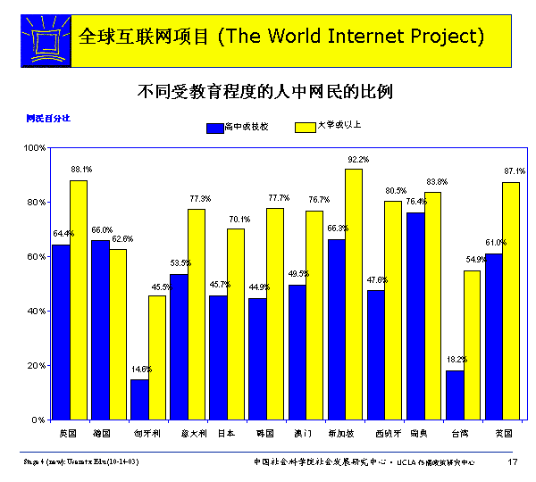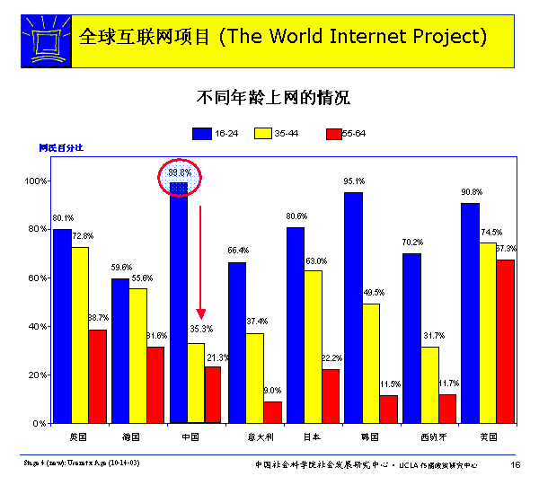 在WIP所有國家里,隨著年齡增加,網民比例減少。某些國家的老年人比其他國家的更可能上網,例如:美國57.3%的55-64歲之間的人上網。而中國網民中的年齡差異則非常明顯。由此可見,年齡是影響上網的一個重要因素。