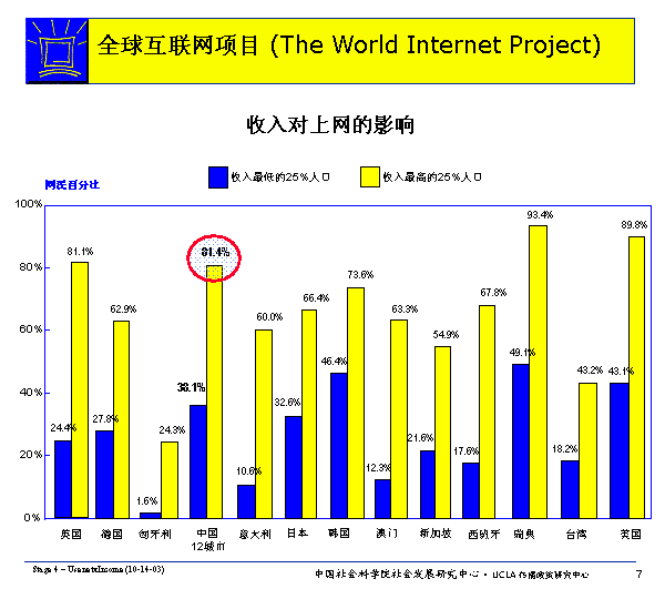 在所有WIP國家里,最富的四分之一人口比最窮的四分之一人口更傾向于上網(這里,中國數據中最富的四分之一網民指(家庭年收入超過5000元者),而最窮的四分之一網民指家庭年收入低于1600元者)。由此可見,經濟收入是影響人們上網的重要因素。