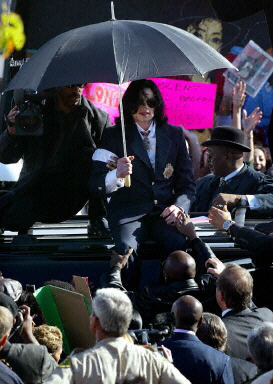杰克遜在抵達加州圣瑪麗亞法庭時受到一群手持歡迎標語牌和支持條幅的歌迷的歡迎。杰克遜是於去年11月被捕的,原因是他被一名10幾歲男童的家庭告到警察局。邁克爾杰克遜不久前開始在圣瑪麗亞第一次出庭,圣瑪麗亞是加利福尼亞中部的一個小鎮,這個小鎮以前還沒有經歷過這樣的大事。