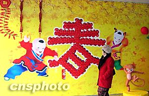 2004年1月14日,行人走過上海街頭一幅“喜娃報春”的年畫前。中國的傳統佳節——春節就要到來,申城街頭隨處可見傳統的中國年畫。井韋 攝