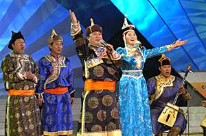 最為奇特的是來自內蒙古大草原的男女兩組呼麥歌手,他們的呼麥唱法,起源于宗教,已有近兩千年歷史。一位歌手一張嘴,同時發出高、中、低三種聲音,分別表示對天、地、神的尊敬。這種獨特古老的演唱方式,曾盛行于蒙古大汗的宮庭,后來才逐漸傳入民間。