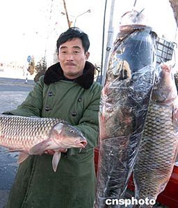 圖:京郊春節市場銷售者推銷巨型鮮活魚