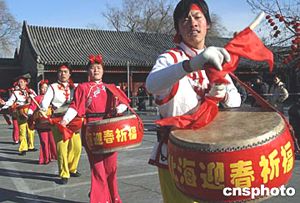 猴年臨近,來自河南新鄉(xiāng)王官營風雷盤鼓藝術團的團員們二十日在北京北海公園表演盤鼓,營造熱烈的佳節(jié)氣氛。中新社記者:張勤