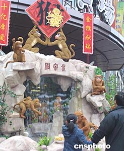 猴年將至,俏皮可愛的“金猴”成為了申城街頭迎新賀春的主角。二十日,一組生動活潑的“金猴鬧春”賀年景觀吸引了不少路人。中新社記者:湯彥俊