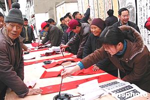 河南許昌尚集鎮(zhèn)書畫村的農民書法家們?yōu)榇迕窳x寫春聯(lián)。尚集鎮(zhèn)民風古樸,文化氛圍濃厚,一直保留著習書的傳統(tǒng)。作者:慎重
