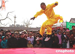 22日中國猴年第一天,北京新奧少林學(xué)校的學(xué)生在北京廠甸兒廟會上龍騰虎躍,出手不凡的少林武功令人大開眼界。中新社記者:鄒憲