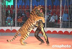 22日大年初一,北京眾多市民一早趕往地壇廟會,欣賞本屆廟會的特色節(jié)目——歡樂馬戲總動員。驚心動魄的人虎大戰(zhàn)讓觀眾大飽眼福。作者:徐曦弋
