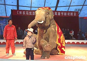 北京地壇廟會今年又添新節目,“歡樂馬戲總動員”的大象為觀眾表演節目拜年。中新社記者:張煒