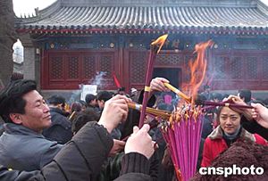 北京最具地方特色的第十八屆白云觀廟會正式開幕,許多工商界人士和市民在財神殿前祈求財運。中新社記者:張煒