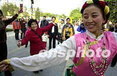 新春佳節,深圳民俗文化村里的大廟會好戲連臺、百藝薈萃,游客在此盡興狂歡過大年。圖為游客與藏族演員一起跳藏族舞蹈。作者:陳文