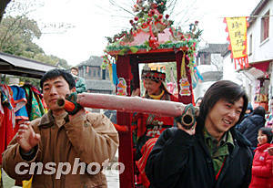 水鄉古鎮同里春節期間推出坐花轎過三橋活動,增加了節日氣氛,眾多游客興致勃勃地坐上了四人抬的大花轎,一邊傾聽著嗩吶等古樂的伴奏聲,一邊觀賞著水鄉古鎮的景色。作者:蔣振江