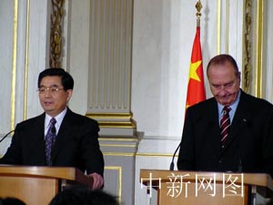 今天是中法建交四十周年紀念日,正在法國進行國事訪問的中國國家主席胡錦濤和希拉克在巴黎進行了正式會談,會談后雙方簽署了“中法聯合聲明”。該聲明強調,中法兩國將深化全面戰略伙伴關系,致力于建立更加安全、更加尊重多樣性和更加團結的世界。