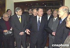 澳門特區(qū)政府二十九日在禮賓府舉行午宴,宴請(qǐng)澳門各新聞媒體,圖為行政長(zhǎng)官何厚鏵向出席午宴的嘉賓拜年。